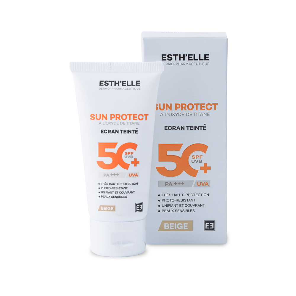 L'ESTHELLE SUN PROTECT ECRAN TEINTE BEIGE SPF50+ 50GR est un soin solaire pour le visage qui combine une très haute protection solaire (SPF 50+ / PA+++) et un effet maquillant unifiant. Spécialement formulé pour offrir une défense maximale contre les rayons UVA et UVB, il aide à préserver le capital solaire de la peau et à prévenir le vieillissement cutané ainsi que l'apparition des taches pigmentaires. Sa texture teintée beige offre une couvrance naturelle qui masque les imperfections, les rougeurs et les boutons, tout en unifiant et en illuminant le teint, sans laisser de traces blanches. Non grasse et résistante à l'eau et à la transpiration, cette crème solaire convient aux conditions d'ensoleillement intenses et laisse la peau hydratée et confortable.