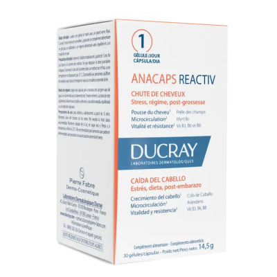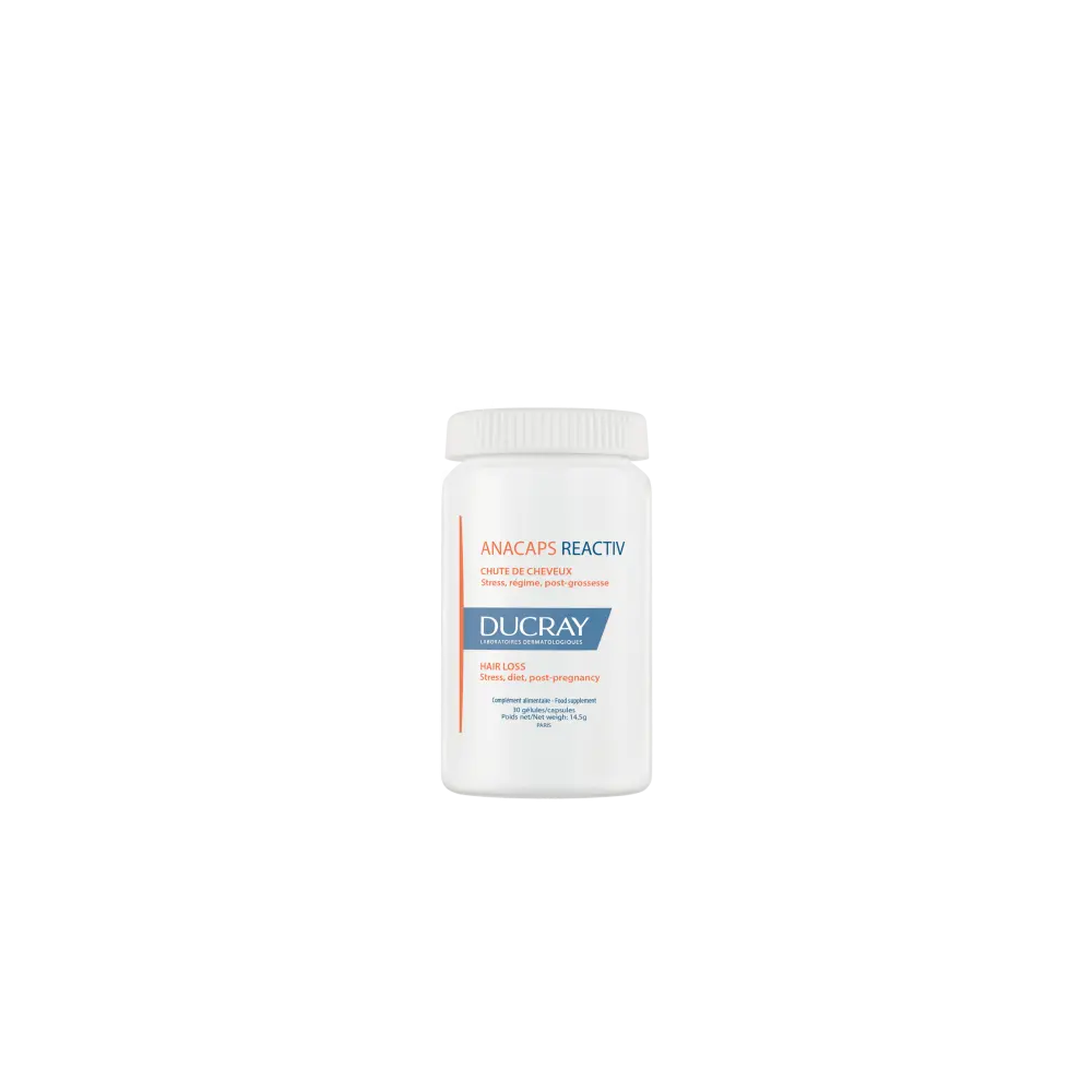 DUCRAY ANACAPS REACTIV est un complément alimentaire sous forme de capsules, formulé pour répondre aux besoins nutritionnels du bulbe pilaire et de la matrice de l'ongle lors des chutes de cheveux réactionnelles (aussi appelées occasionnelles ou aiguës). Ce type de chute est souvent déclenché par des facteurs externes ou internes spécifiques et temporaires, comme le stress, une grande fatigue, un régime alimentaire restrictif, une période post-accouchement (post-partum), ou un changement de saison. Anacaps Reactiv apporte au bulbe pilaire des nutriments essentiels pour stimuler la pousse des cheveux, améliorer leur vitalité et augmenter leur résistance. Il agit également pour fortifier les ongles fragilisés. Sa formule complète contient des acides aminés soufrés (constituants majeurs de la kératine) ainsi que des vitamines et des minéraux. Une seule capsule par jour suffit, ce qui en fait un traitement pratique pour une cure d'un mois.