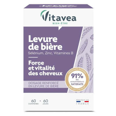 VITAVEA LEVURE DE BIÈRE + SÉLÉNIUM + ZINC 60 COMPRIMÉS est un complément alimentaire conçu pour soutenir la beauté et la santé des cheveux, de la peau et des ongles. Sa formule unique combine la levure de bière, naturellement riche en vitamines du groupe B, avec le sélénium et le zinc, deux minéraux essentiels. Cette synergie d'actifs agit de l'intérieur pour fortifier et revitaliser.