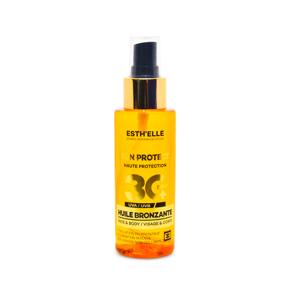 L'ESTHELLE SUN PROTECT HUILE BRONZANTE 100ML est une huile sèche solaire conçue pour le visage et le corps. Elle offre une double action : une protection efficace contre les UVA/UVB avec un SPF30+, tout en stimulant et en intensifiant le processus naturel de bronzage pour un hâle doré, lumineux et uniforme. Formulée pour être non grasse et non collante, elle pénètre rapidement, laissant la peau satinée, nourrie et enveloppée d'un délicieux parfum. Cette huile est également enrichie en agents hydratants pour prévenir le dessèchement cutané lié à l'exposition solaire, assurant ainsi une peau douce et souple. Sa formule photostable garantit une protection durable, même après un contact avec l'eau.