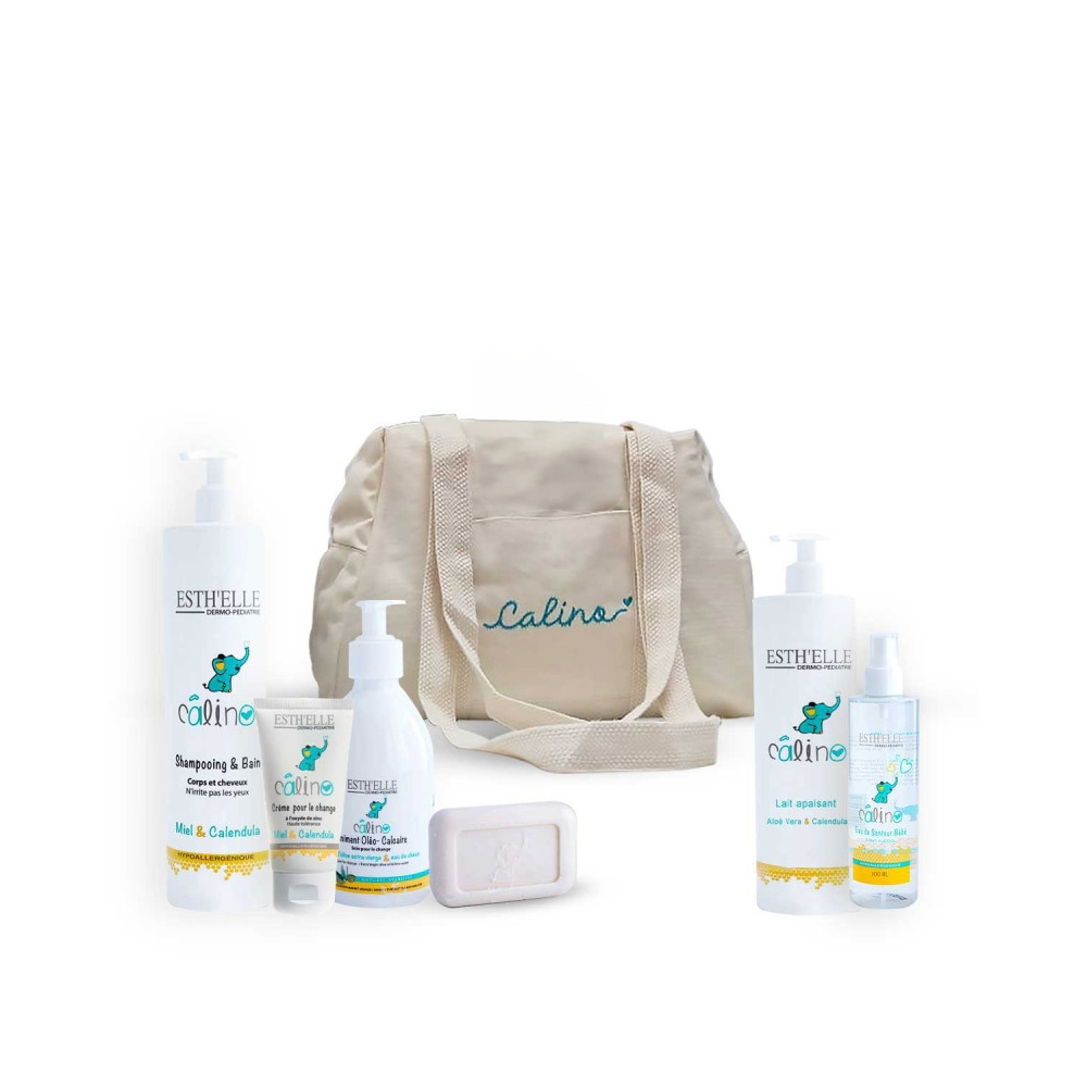 L'ESTHELLE CALINO SAC MAMAN (souvent appelé Sac de Naissance) est un trousseau complet qui regroupe les produits essentiels de la gamme CALINO pour la toilette, le soin et le confort du nouveau-né. L'ensemble est présenté dans un sac de maternité/maman offert, à la fois pratique et élégant, permettant de transporter facilement les affaires de bébé. Conçus avec des formules douces et respectueuses de la peau sensible des tout-petits, les produits CALINO visent à hydrater, apaiser et protéger au quotidien. Ce kit est idéal pour préparer l'arrivée de bébé, pour les séjours à la maternité ou comme cadeau de naissance.