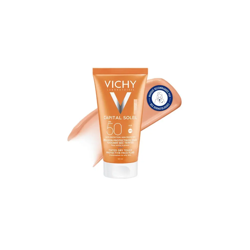 L'émulsion teintée toucher sec SPF50 Capital Soleil de Vichy est un soin solaire innovant conçu pour les peaux mixtes à grasses. Sa formule haute protection associe des filtres UVA/UVB à large spectre pour prévenir les dommages causés par le soleil, le vieillissement prématuré et l'apparition de taches pigmentaires. Sa texture légère, fondante et non grasse, enrichie en pigments minéraux, s'absorbe instantanément et laisse un fini mat et velouté. Elle unifie le teint et floute les imperfections pour un effet bonne mine immédiat, sans obstruer les pores ni laisser de sensation collante. Elle est également enrichie en eau thermale de Vichy aux propriétés apaisantes et fortifiantes.