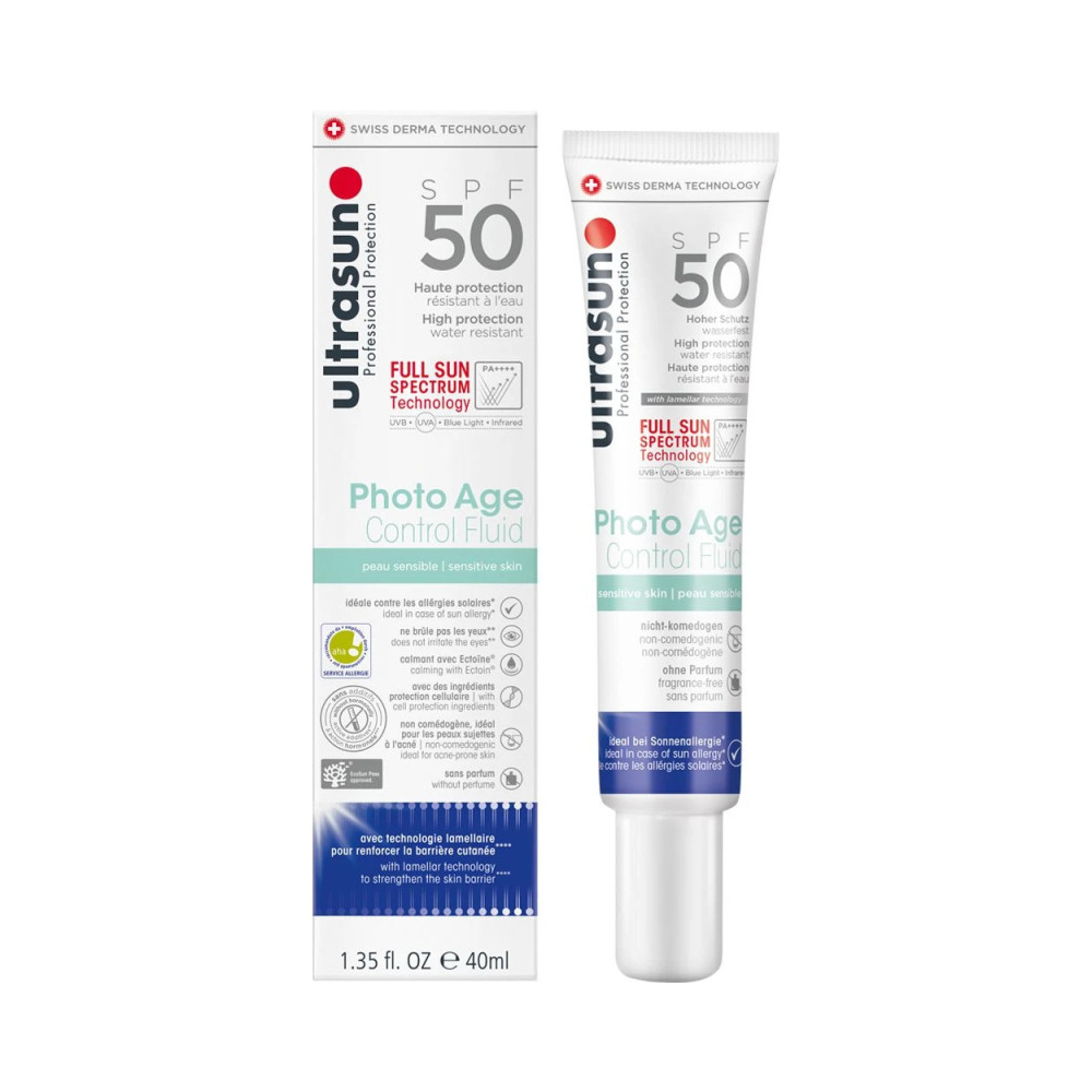 Ce fluide ULTRASUN Photo Age Control SPF50 de 40 ml est une protection solaire visage haute performance, spécifiquement conçue pour prévenir et corriger les signes du photovieillissement. Il offre une protection solaire très élevée tout en ciblant les rides et la perte d'élasticité. Son format pratique en fait un excellent choix pour une utilisation quotidienne.