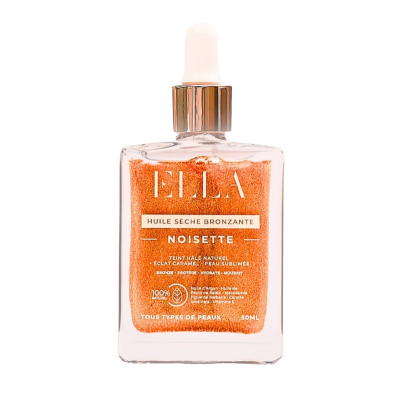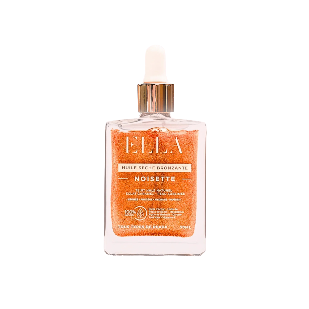 L'ELLA Huile Sèche Bronzante est un soin illuminateur et sublimateur multi-actions (visage, corps et cheveux) conçu pour offrir un effet "sun-kissed" immédiat et rehausser le bronzage. Sa texture est une véritable innovation : sèche et ultra-légère, elle pénètre rapidement sans laisser de film gras ou collant sur la peau. Enrichie d'un cocktail d'huiles végétales précieuses, elle nourrit, hydrate et adoucit intensément l'épiderme. Les fines nacres bronzantes/irisées (Rose Gold, Noisette ou Dorée) captent délicatement la lumière pour un fini satiné et lumineux qui sublime le hâle. En plus de son rôle esthétique, elle protège, nourrit et laisse un parfum délicat et envoûtant sur la peau et les cheveux.