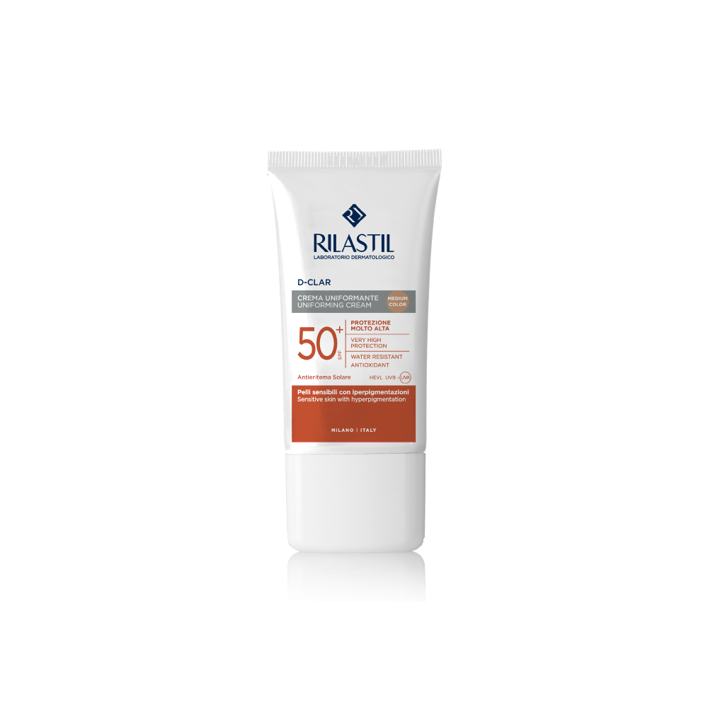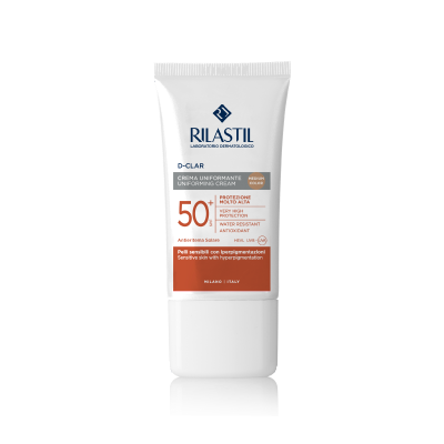 résenté dans un tube de 50ml, le Rilastil D-CLAR Crème Uniformisante Medium SPF50+ est une crème photoprotectrice à la texture veloutée et confortable. Elle contient des pigments uniformisants de couleur "medium" qui permettent de masquer immédiatement les taches brunes et les irrégularités de pigmentation, offrant un teint plus homogène et lumineux.
