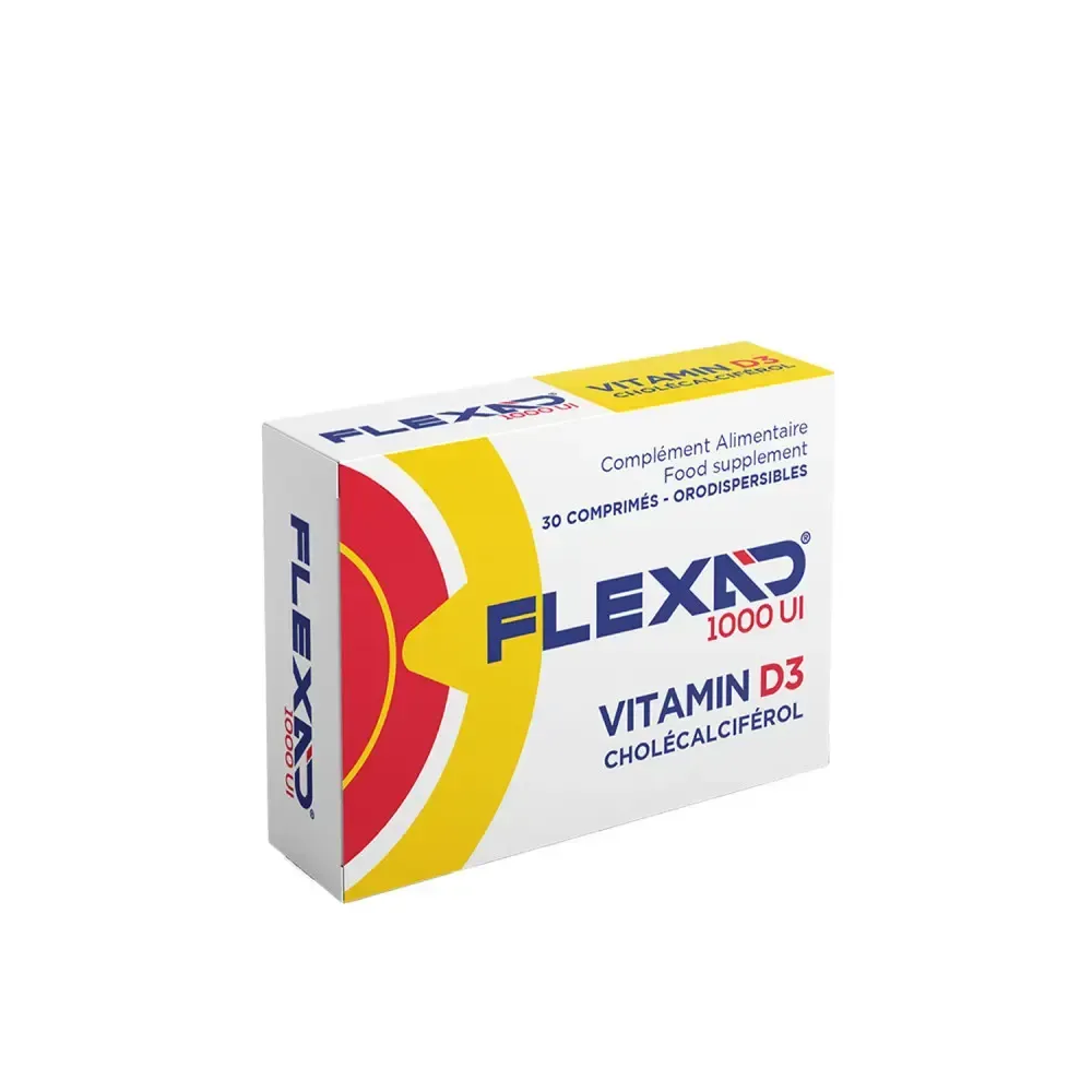 FLEXAD 1000 UI VITAMINE D3 est un complément alimentaire conçu pour maintenir l'équilibre en vitamine D dans l'organisme. Une dose de 1000 UI (Unités Internationales) par comprimé est idéale pour un usage quotidien et pour soutenir la santé des os, des dents et du système immunitaire.