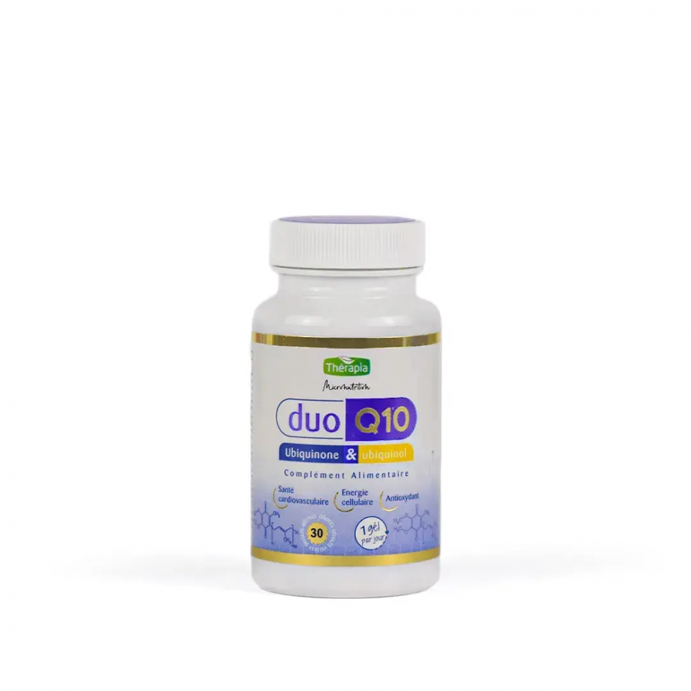 THERAPIA DUO Q10 est un complément alimentaire formulé pour la protection cellulaire et le maintien de la vitalité de l'organisme. Son innovation réside dans l'association de deux formes de Coenzyme Q10 (CoQ10) : l'Ubiquinone et l'Ubiquinol. La Coenzyme Q10, naturellement présente dans le corps, est essentielle à la production d'énergie cellulaire (synthèse d'ATP dans les mitochondries) et agit comme un puissant antioxydant. Ce complément est particulièrement indiqué pour soutenir la santé cardiovasculaire, lutter contre la fatigue chronique et protéger les cellules du stress oxydatif, notamment celles du cœur et des neurones. Il est également souvent recommandé pour compenser la diminution de CoQ10 induite par certains traitements hypocholestérolémiants (statines).