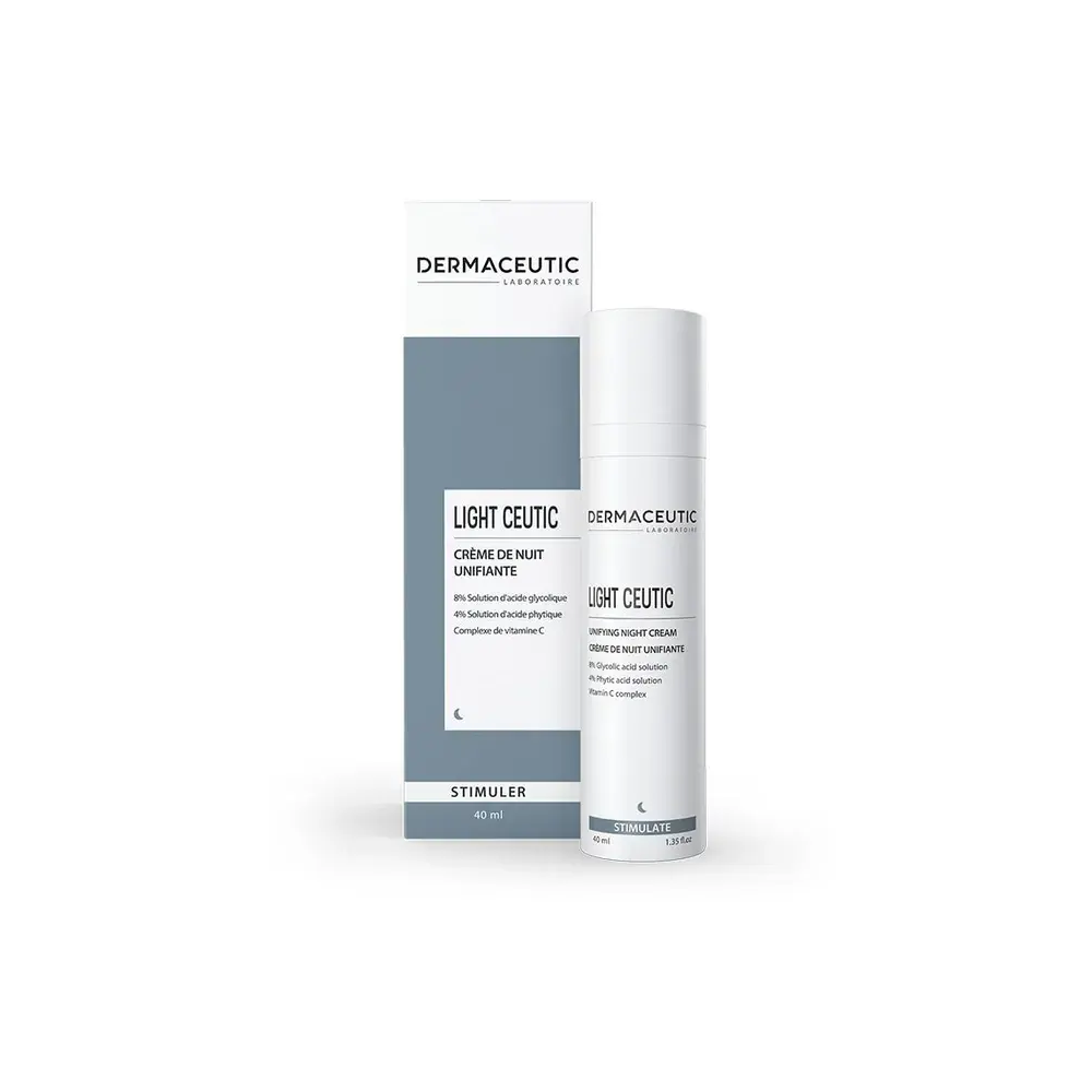 DERMACEUTIC LIGHT CEUTIC est un soin de nuit éclaircissant et anti-âge, conçu pour les peaux ternes et sujettes aux taches. Sa formule, riche en acides et en actifs dépigmentants, agit pendant le sommeil pour unifier le teint, réduire l'apparence des taches et révéler une peau plus lumineuse.