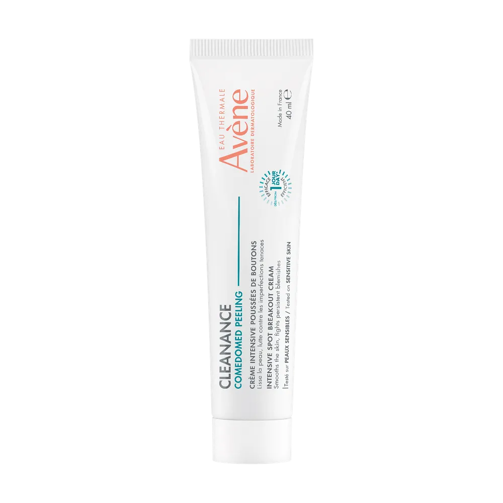 L'AVENE CLEANANCE COMEDOMED PEELING CRÈME INTENSIVE POUSSÉES DE BOUTONS 40ML est un soin d'attaque ultra-efficace, spécifiquement formulé pour les peaux à tendance acnéique sujettes aux poussées soudaines et aux imperfections tenaces (boutons, rougeurs). Il s'agit d'une crème peeling intensive qui agit rapidement, avec des résultats visibles dès le premier jour d'application. Sa formule combine un duo d'actifs dermatologiques puissants pour réduire le volume et la rougeur des boutons, exfolier la peau et prévenir la formation de nouvelles imperfections. Sa texture crème, non grasse et rapidement absorbée, est légèrement orangée, laissant un fini confortable. Elle est conçue pour être utilisée en cure de courte durée pour maîtriser les épisodes acnéiques.