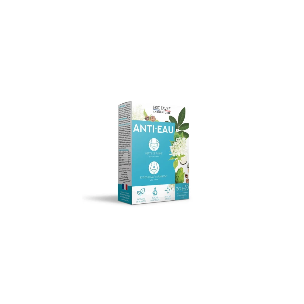 ERIC FAVRE ANTI EAU est un complément alimentaire sous forme de comprimés, spécialement formulé pour aider à lutter contre la rétention d'eau et les sensations de gonflement. Sa formule est une synergie d'extraits de plantes, de vitamines et de minéraux qui agissent sur le drainage et l'élimination de l'excès d'eau dans les tissus. Il contient notamment du pissenlit, du thé vert et du bouleau, des plantes reconnues pour leurs propriétés diurétiques et dépuratives. Ce complément est idéal pour les personnes qui se sentent gonflées, qui ont les jambes lourdes ou qui souhaitent affiner leur silhouette en complément d'une alimentation saine.