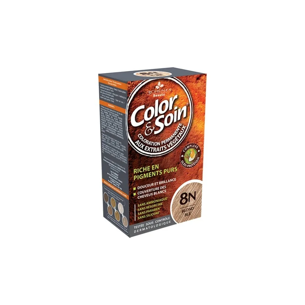 3 CHENES COLOR & SOIN COLORATION BLOND BLÉ 8N est une coloration capillaire permanente reconnue pour sa formule douce et sa couvrance efficace des cheveux blancs, tout en respectant la fibre capillaire.
