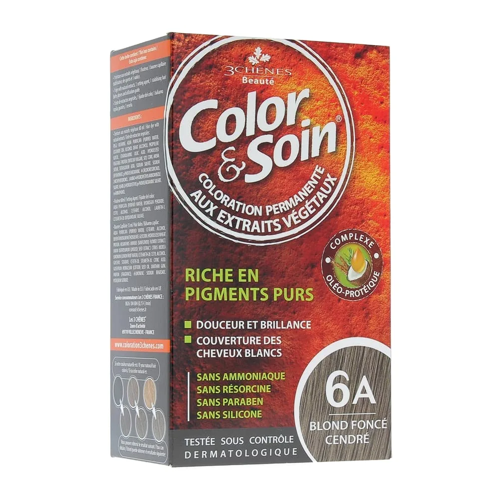 3 CHENES COLOR & SOIN COLORATION BLOND FONCE CENDRÉ 6A est une coloration capillaire permanente formulée à base d'extraits végétaux. Elle est conçue pour teindre les cheveux en couvrant 100% des cheveux blancs dès la première application, tout en les protégeant et en les soignant.