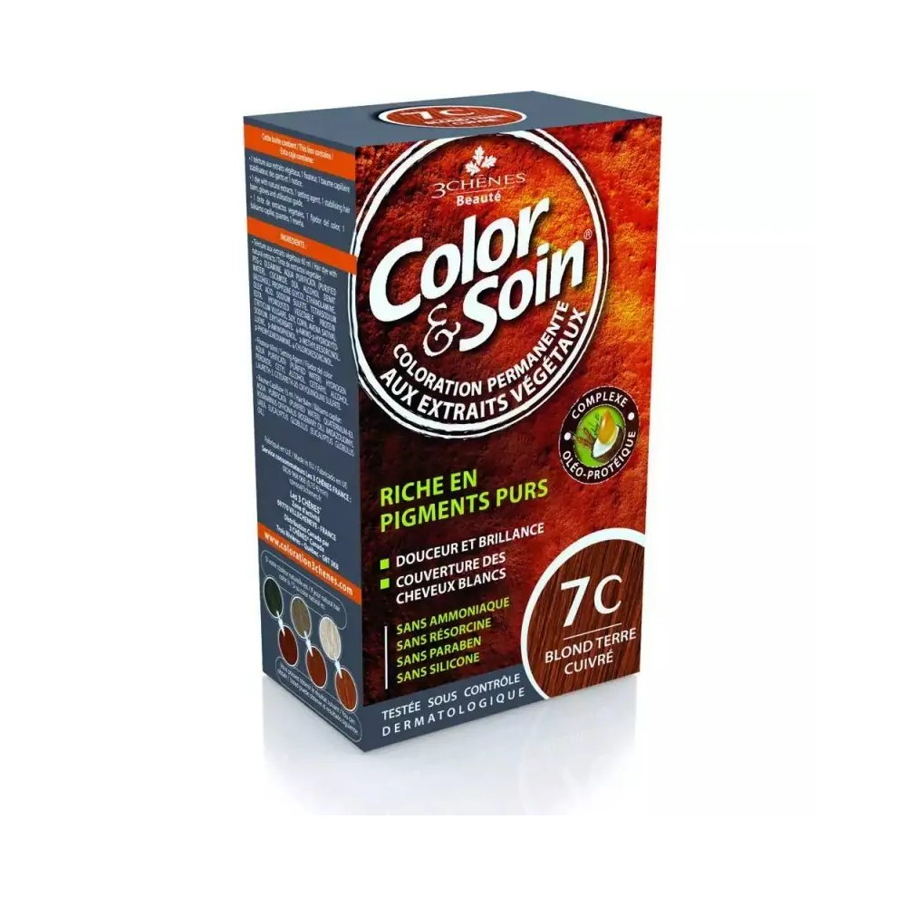 3 CHENES COLOR & SOIN COLORATION BLOND TERRE CUIVRE 7C est une coloration capillaire permanente formulée à base d'extraits végétaux, conçue pour teindre les cheveux en couvrant intégralement les cheveux blancs, tout en les protégeant et en les soignant.