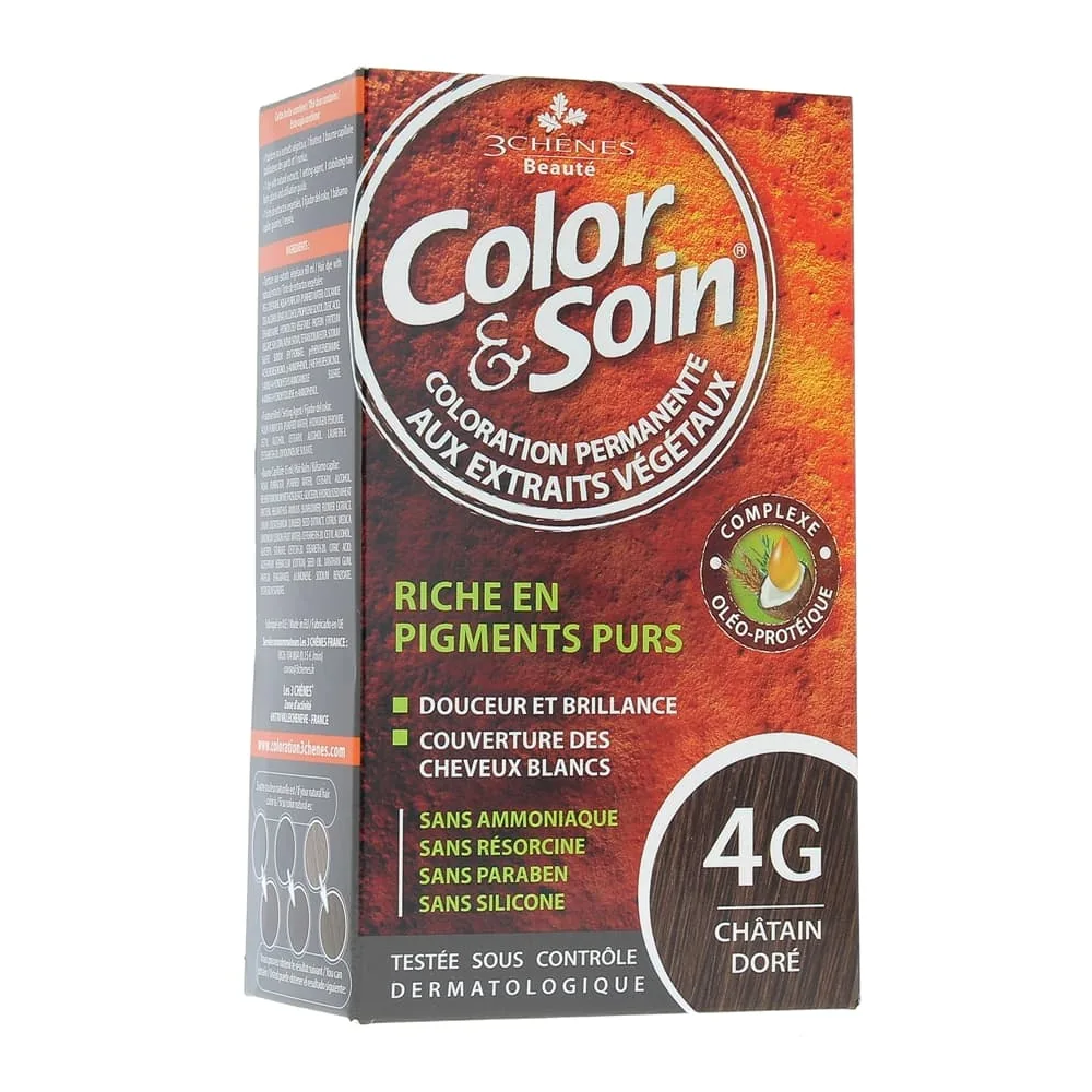 3 CHENES COLOR & SOIN COLORATION CHATAIN DORE 4G est une coloration capillaire permanente formulée à base d'extraits végétaux, conçue pour teindre les cheveux tout en les soignant.