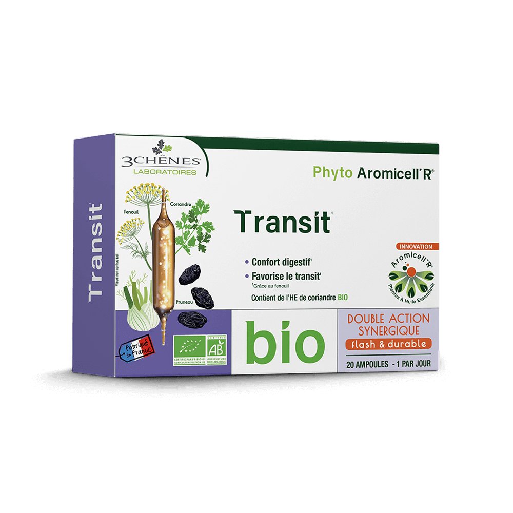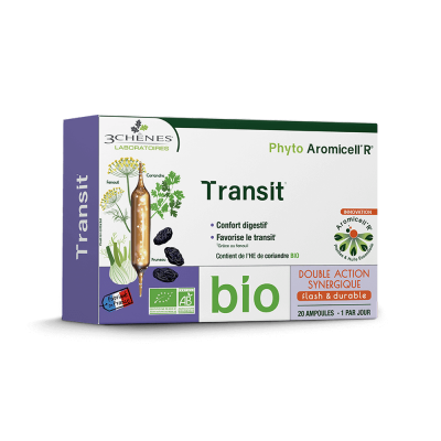 3 CHENES PHYTO AROMICELL'R TRANSIT 20 AMPOULES est un complément alimentaire certifié biologique, présenté sous forme d'ampoules buvables. Il est spécifiquement formulé par Les 3 Chênes pour soutenir le confort digestif et favoriser un transit intestinal régulier.
