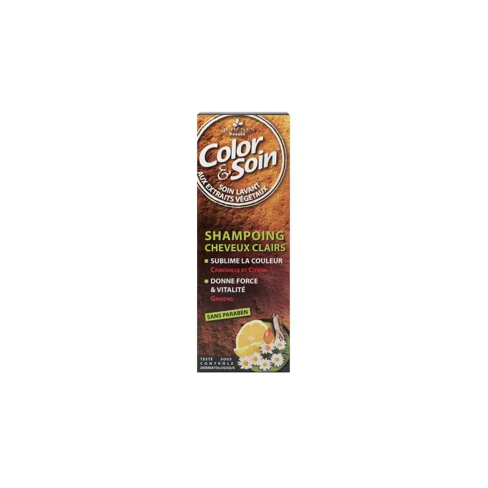 Le shampooing COLOR & SOIN Cheveux Colorés Clairs est un soin capillaire spécialement formulé pour les cheveux blonds, méchés ou décolorés. Il aide à prolonger l'éclat de la couleur, à protéger la fibre capillaire et à neutraliser les reflets jaunes indésirables. Sa formule, enrichie en Huile d'Argan Bio et en extrait de tournesol, nourrit et protège le cheveu des agressions extérieures. L'Huile d'Argan hydrate et fortifie la fibre capillaire, la laissant douce et brillante, tandis que l'extrait de tournesol agit comme un filtre UV naturel qui prévient la décoloration due au soleil. Le shampooing contient également des pigments violets qui neutralisent les reflets jaunes ou orangés, pour un blond plus pur et lumineux. Sa base lavante, douce et sans sulfate, nettoie délicatement le cuir chevelu sans l'agresser.