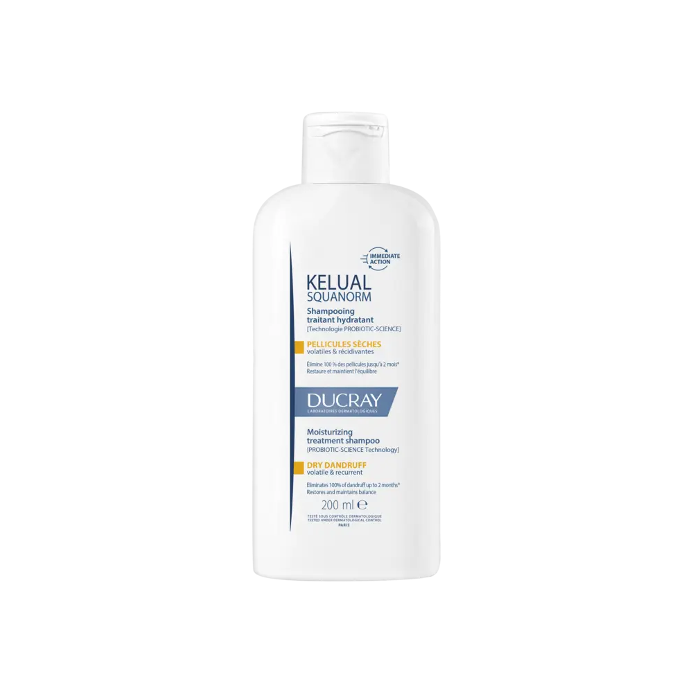 Le DUCRAY SQUANORM SHAMPOOING PELLICULES SÈCHES (200ML) est un soin traitant spécifiquement formulé pour éliminer les pellicules sèches non adhérentes et apaiser le cuir chevelu sec et irrité. Les pellicules sèches sont fines, blanches, et tombent sur les épaules. Ce shampooing agit en douceur pour nettoyer le cuir chevelu tout en le réhydratant, ce qui permet de limiter la desquamation excessive responsable de l'apparition des pellicules. Il contribue également à calmer rapidement les démangeaisons et les sensations de tiraillements.
