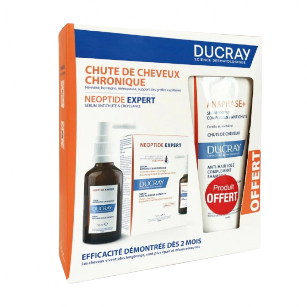 Ce duo DUCRAY NEOPTIDE EXPERT SERUM + ANAPHASE+ SHAMPOOING ANTI CHUTE est une routine de soin complète, conçue pour lutter efficacement contre la chute de cheveux chronique (liée à l'âge, au stress, à l'hérédité) et stimuler une croissance saine et vigoureuse chez l'homme comme chez la femme. Le sérum NEOPTIDE EXPERT est le soin traitant au cœur de cette routine : il possède une double action anti-chute et croissance, agissant en profondeur au niveau du cuir chevelu. Il renforce l'ancrage des cheveux et densifie la chevelure. Le shampooing ANAPHASE+ est le complément idéal, offert dans ce pack, qui nettoie en douceur, prépare le cuir chevelu à recevoir le sérum et apporte volume et force à la fibre capillaire. L'association des deux produits vise à potentialiser l'efficacité du traitement pour des cheveux visiblement plus forts, plus denses et plus volumineux, avec des résultats cliniques démontrés dès 2 mois.