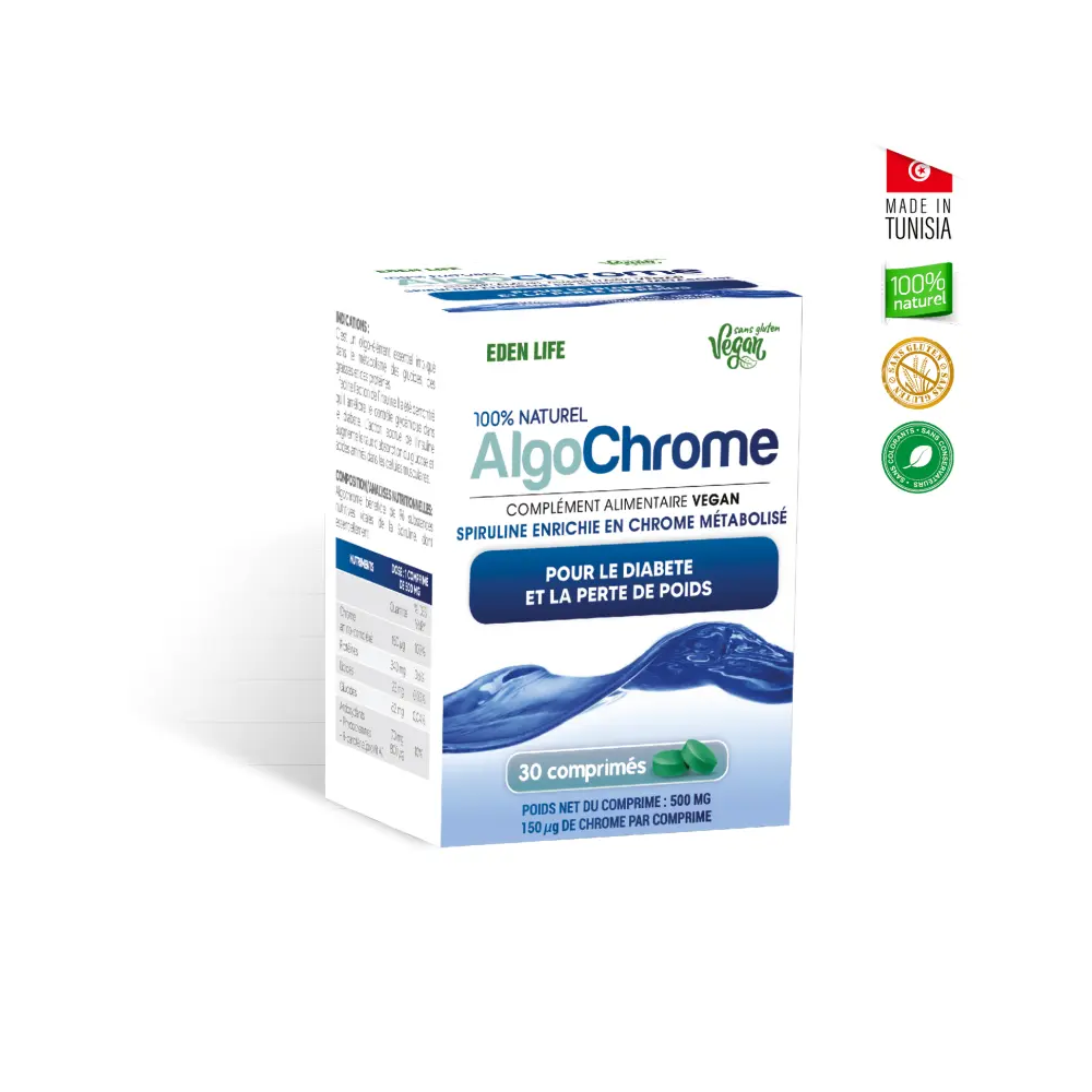 EDEN LIFE ALGO CHROME est un complément alimentaire sous forme de comprimés, spécifiquement formulé pour apporter du chrome à l'organisme sous une forme hautement biodisponible. Son efficacité repose sur l'innovation de l'amino-complexation avec de la spiruline. Ce procédé unique permet d'intégrer le chrome à la structure des acides aminés de la spiruline, une microalgue reconnue pour sa richesse nutritionnelle. Cette liaison naturelle garantit une meilleure absorption et une utilisation optimale du chrome par le corps, minimisant ainsi les risques de mauvaises assimilations. Le chrome est un oligo-élément essentiel qui joue un rôle crucial dans le métabolisme des macronutriments (glucides, lipides, protéines).