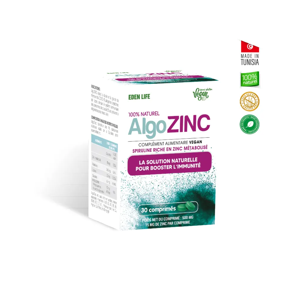 EDEN LIFE ALGOZINC est un complément alimentaire sous forme de comprimés, spécifiquement conçu pour apporter à l'organisme une source de zinc hautement biodisponible. Sa formule repose sur une innovation clé : le zinc est amino-complexé avec de la spiruline. Cette association unique permet une meilleure assimilation et utilisation du zinc par le corps, comparée aux formes de zinc plus courantes. La spiruline, reconnue pour sa richesse nutritionnelle, agit comme un vecteur naturel, facilitant le transport et l'absorption de cet oligo-élément essentiel.