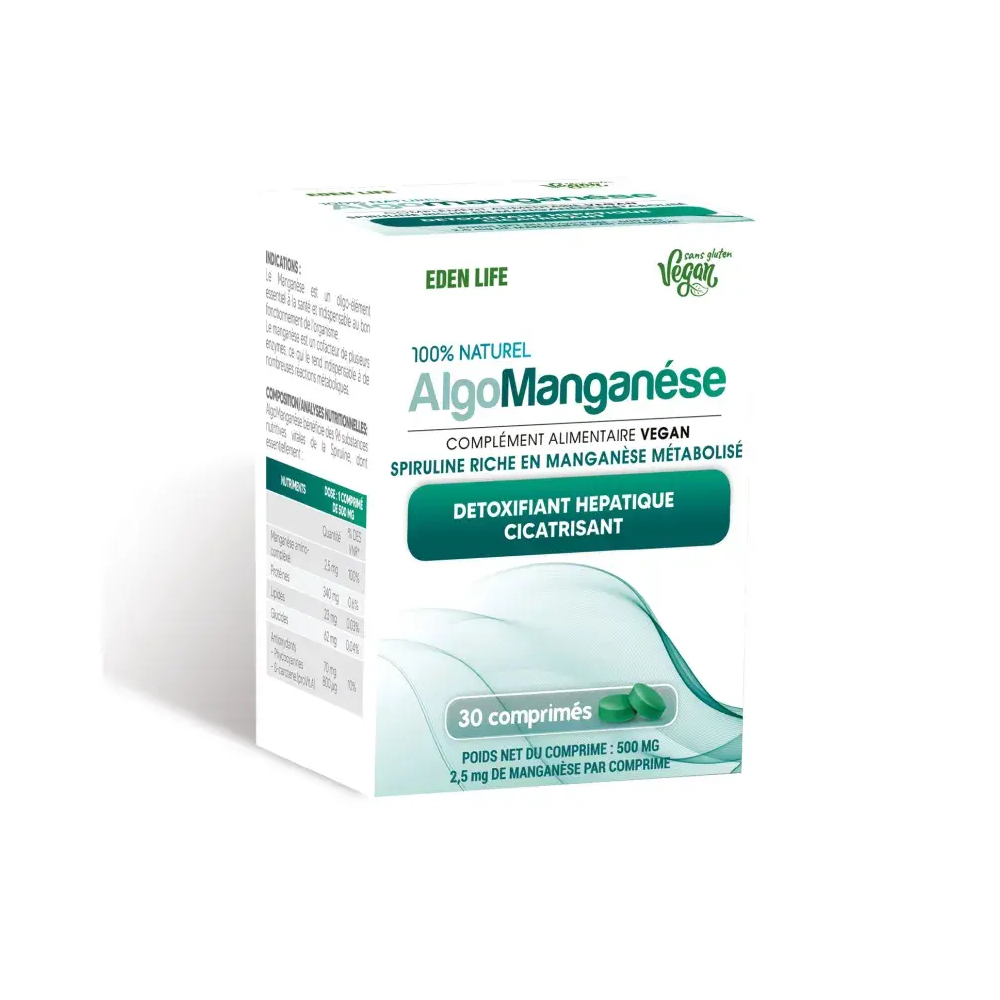 EDEN LIFE ALGO MANGANÈSE est un complément alimentaire sous forme de comprimés, spécifiquement formulé pour apporter du manganèse à l'organisme sous une forme hautement assimilable. Sa particularité réside dans l'utilisation d'un procédé d'amino-complexation avec de la spiruline, une microalgue riche en nutriments. Le manganèse est un oligo-élément essentiel qui participe à de nombreuses réactions enzymatiques du corps. En étant lié aux acides aminés de la spiruline, il bénéficie d'une biodisponibilité optimale, ce qui garantit une meilleure absorption et utilisation par l'organisme.