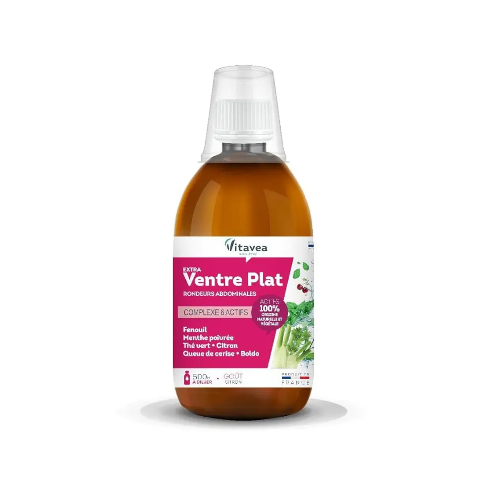 VITAVEA EXTRA VENTRE PLAT est un complément alimentaire sous forme de solution buvable de 500 ml, spécialement conçu pour aider à retrouver un ventre plus plat et plus léger. Sa formule à base de plantes et de fruits agit en synergie pour favoriser le drainage, améliorer la digestion et réduire les ballonnements.