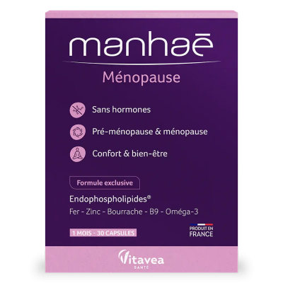 VITAVEA MANHAE MÉNOPAUSE 30 CAPSULES est un complément alimentaire de la marque Manhaé, spécifiquement formulé pour accompagner les femmes pendant la périménopause et la ménopause. Sa formule est une synergie d'actifs d'origine naturelle, de vitamines et de minéraux qui agissent pour soulager les principaux désagréments liés à cette période, sans recourir aux hormones ni aux phytoestrogènes. Ce produit est un allié précieux pour un bien-être au quotidien, en ciblant les bouffées de chaleur, la nervosité et la fatigue.