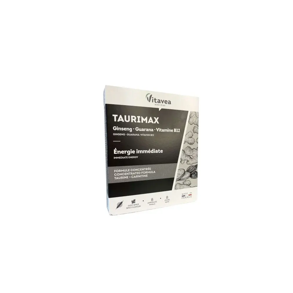 VITAVEA TAURIMAX 8 AMPOULES est un complément alimentaire sous forme d'ampoules buvables, conçu pour dynamiser l'organisme et combattre la fatigue intense. Sa formule est une synergie d'actifs d'origine naturelle et de vitamines, comme la taurine, le guarana et les vitamines du groupe B, qui agissent pour un coup de fouet immédiat et une vitalité durable. Ce produit est un allié précieux en cas de surmenage, d'examens, de sport intense ou de période de grande fatigue.