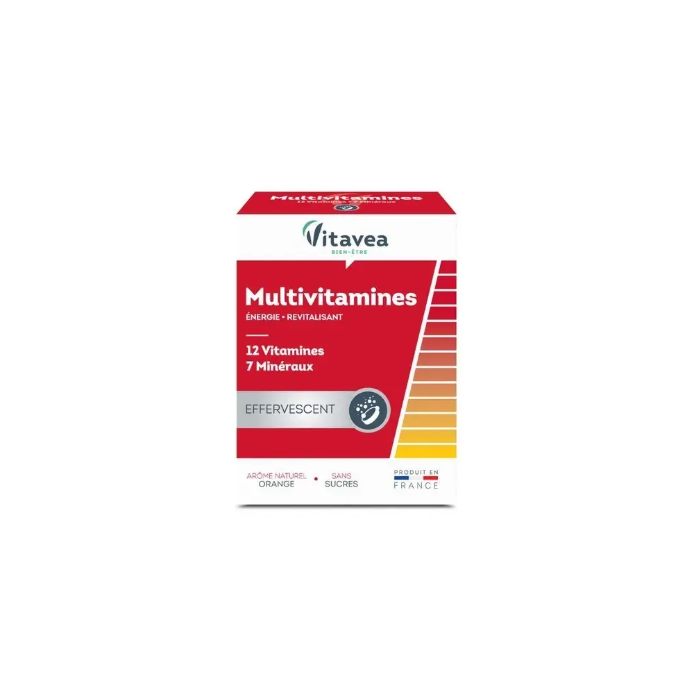VITAVEA MULTIVITAMINES 12 VITAMINES + 7 OLIGO-ÉLÉMENTS 24 COMPRIMÉS est un complément alimentaire conçu pour soutenir la vitalité physique et intellectuelle et combattre la fatigue. Sa formule est une synergie de 12 vitamines (A, C, E, B1, B2, B3, B5, B6, B8, B9, B12) et de 7 minéraux et oligo-éléments (magnésium, zinc, fer, cuivre, manganèse, sélénium, chrome). Ce produit est un allié précieux pour l'organisme en période de surmenage, de changement de saison ou de manque d'énergie, aidant à combler les déséquilibres nutritionnels et à renforcer les défenses naturelles.