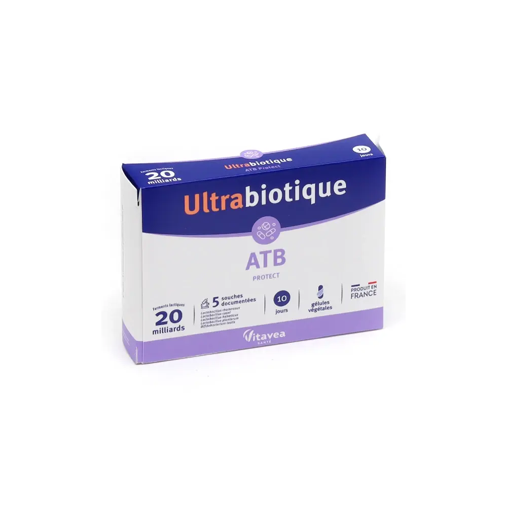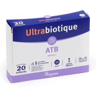 VITAVEA ULTRABIOTIQUE ATB PROTECT 10 GÉLULES est un complément alimentaire de la marque VITAVEA, spécifiquement formulé pour protéger et restaurer la flore intestinale durant et après un traitement aux antibiotiques. Les antibiotiques, tout en ciblant les bactéries pathogènes, peuvent aussi déséquilibrer le microbiote intestinal. Ce produit est une synergie de ferments lactiques (probiotiques) rigoureusement sélectionnés et d'actifs qui aident à maintenir l'équilibre intestinal et à réduire les effets secondaires digestifs des antibiotiques, comme la diarrhée.