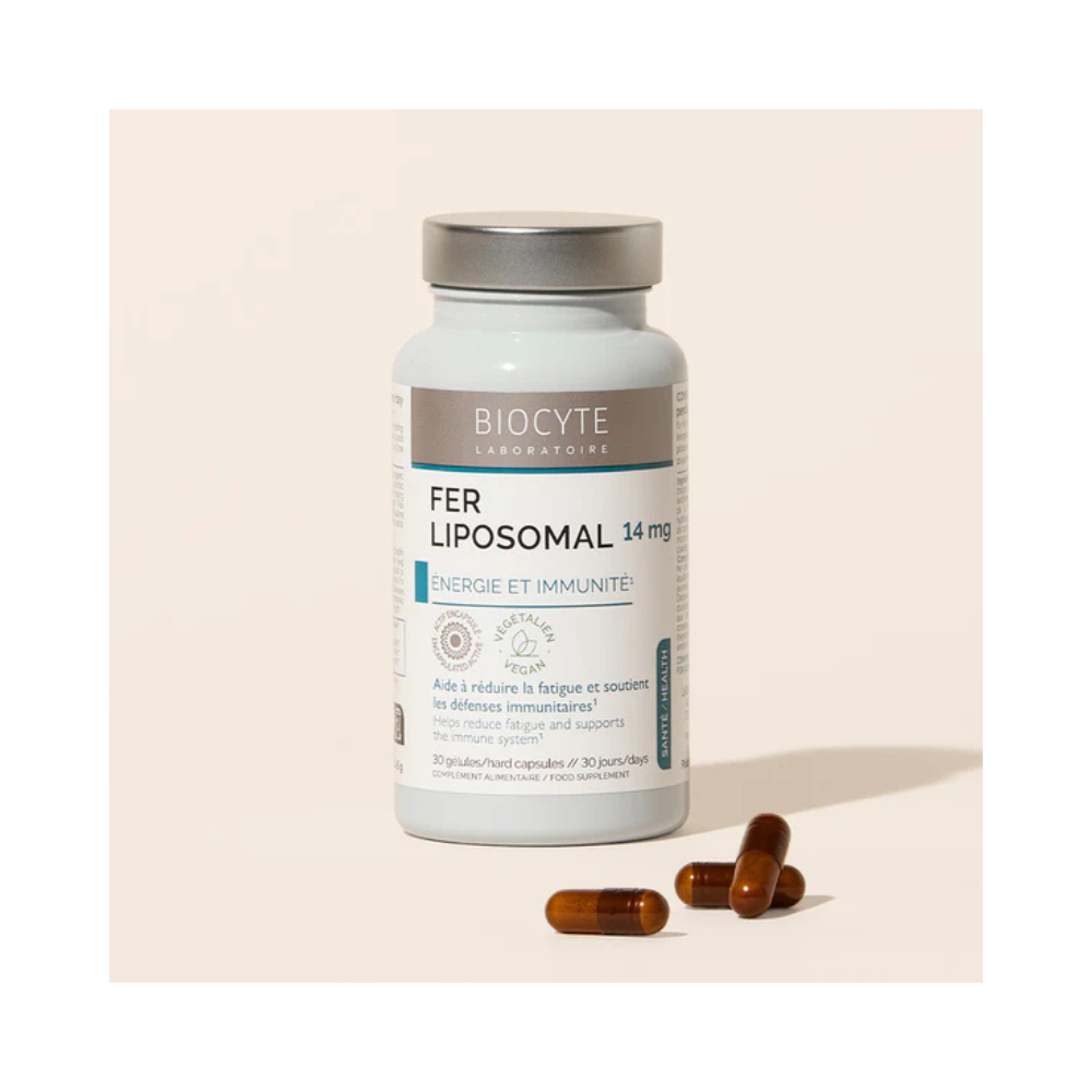 Le FER LIPOSOMAL ÉNERGIE ET IMMUNITÉ 30 GÉLULES de Biocyte est un complément alimentaire conçu pour fournir du Fer de manière optimisée aux personnes souffrant de fatigue, de baisse d'énergie ou de besoins accrus (femmes enceintes, menstruations abondantes, sportifs, végétariens). Le Fer est un minéral vital, essentiel pour le transport normal de l'oxygène dans le corps et la formation des globules rouges. Il contribue également à réduire la fatigue et soutient le fonctionnement normal du système immunitaire. La formulation utilise la technologie liposomale : le Fer est encapsulé dans des liposomes (petites vésicules lipidiques) pour une meilleure absorption intestinale et une excellente tolérance digestive, évitant les désagréments habituels du fer classique (constipation, irritations).