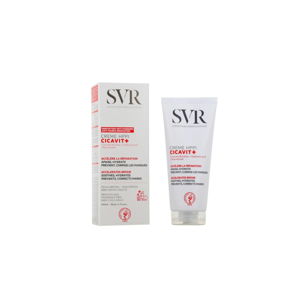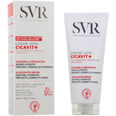 La crème réparatrice CICAVIT+ Crème HPPI de SVR est un soin intensif conçu pour réparer, apaiser et protéger les peaux abîmées et irritées de toute la famille. Sa formule, dotée de la technologie HPPI (Hydro-Protecting Polymer), accélère la réparation cutanée et réduit visiblement les rougeurs et les marques. Le complexe réparateur CICAVIT+, riche en micro-organismes et en sucre prébiotique, agit sur la restauration de la flore cutanée et stimule la cicatrisation naturelle. Sa texture fondante et non grasse forme un film protecteur invisible qui isole la peau des agressions extérieures. Elle apaise immédiatement les irritations, les démangeaisons et les sensations de tiraillement. Idéale pour les coupures, les écorchures, les irritations dues aux frottements, les rougeurs post-épilation, les coups de soleil ou les tatouages.