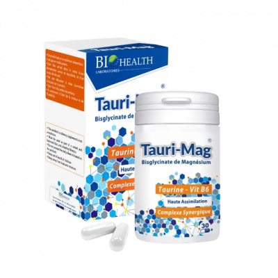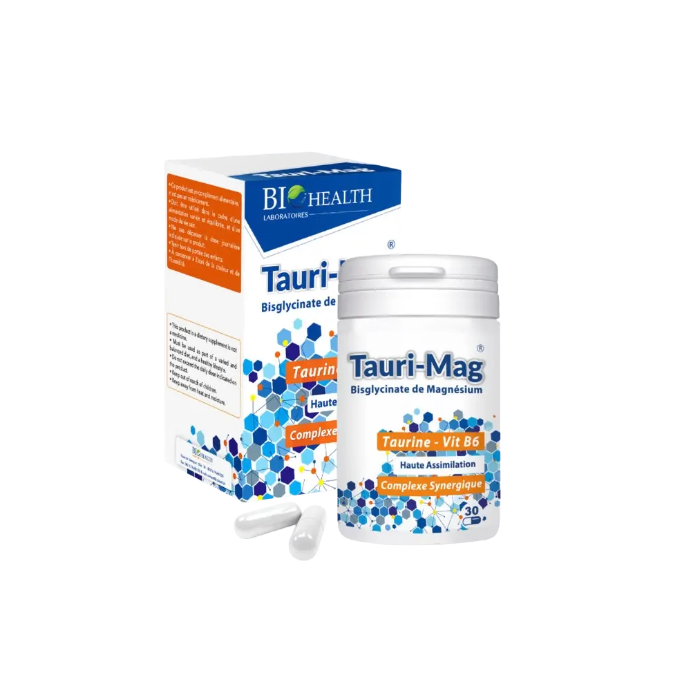 Les gélules Tauri Mag de Biohealth sont un complément alimentaire formulé pour réduire la fatigue, le stress et favoriser l'équilibre nerveux. Ce produit est une synergie de taurine, de magnésium marin et de vitamine B6, trois nutriments essentiels qui agissent de concert pour soutenir le système nerveux et le métabolisme énergétique. Le magnésium est un minéral crucial pour le bon fonctionnement des muscles et la transmission nerveuse. Associé à la taurine, il contribue à la relaxation et à la diminution des états de stress et d'anxiété. La vitamine B6 complète cette formule en facilitant l'absorption du magnésium par l'organisme et en participant à la réduction de la fatigue. Tauri Mag est idéal pour les personnes soumises à une période de stress, de surmenage ou de fatigue intense.