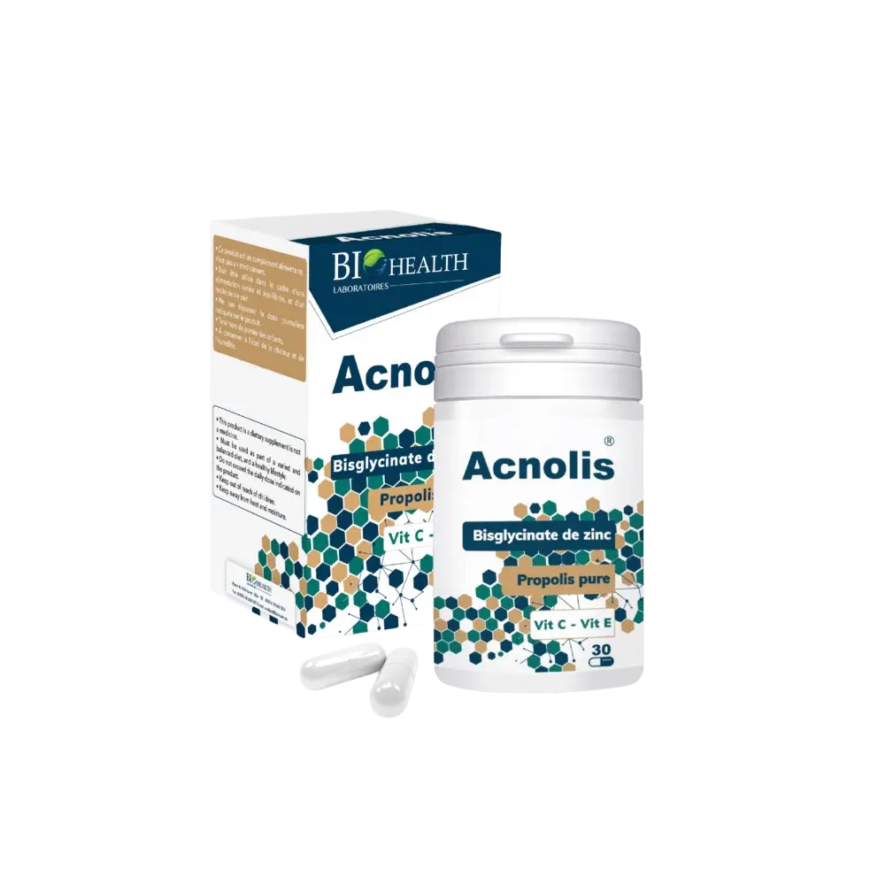 Les gélules Acnolis de Biohealth sont un complément alimentaire formulé pour cibler les problèmes de peau, en particulier l'acné, la dermatite ou le psoriasis. Sa composition est un concentré d'actifs essentiels qui agissent de l'intérieur pour assainir et réguler l'épiderme. Le zinc bisglycinate, sous une forme hautement biodisponible, régule la production de sébum, un facteur clé dans l'apparition des imperfections. Le complément est également enrichi en propolis, un ingrédient naturel reconnu pour ses propriétés purifiantes et apaisantes. Les vitamines C et E complètent la formule en apportant une action antioxydante puissante qui protège les cellules cutanées du stress oxydatif, responsable du vieillissement prématuré et de l'inflammation. En plus de ses bienfaits sur la peau, ce complément contribue à la santé des cheveux et des ongles et renforce le système immunitaire.
