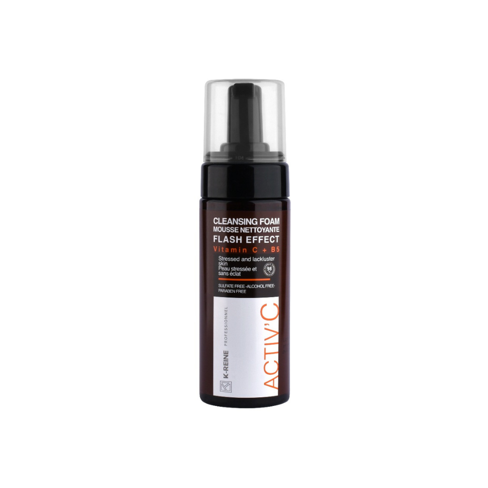 La Mousse Nettoyante Flash Effect ACTIV C+B5 de K-REINE est un soin lavant pour le visage qui combine l'efficacité d'un nettoyage en profondeur avec les bénéfices éclat et anti-fatigue des vitamines. Sa texture est une mousse fine, douce et aérienne qui enveloppe le visage pour une sensation de fraîcheur immédiate. Enrichie en Vitamine C (l'actif Éclat) et en Pro-Vitamine B5 (Panthénol, l'actif Confort), elle nettoie et démaquille efficacement tout en combattant les signes de fatigue et le stress oxydatif. La Vitamine C stimule l'éclat naturel et neutralise les radicaux libres, tandis que la Pro-Vitamine B5 hydrate intensément et apaise la peau. Le résultat est un teint visiblement plus lumineux et uniforme, un grain de peau affiné, sans tiraillements ni dessèchement. Sa formule est douce, sans alcool, sans parabènes et sans savon.