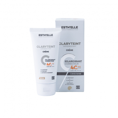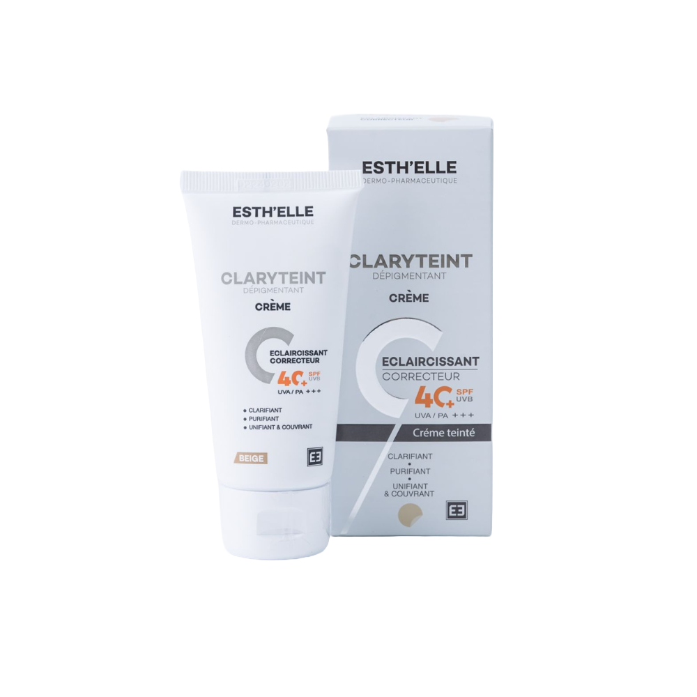 L'ESTHELLE ECRAN CLARYTEINT BEIGE SPF40+ est un soin de jour complet qui associe une haute protection solaire (SPF40+) à une action dépigmentante, éclaircissante et correctrice de teint. Sa formule teintée en beige permet d'unifier immédiatement le teint, de camoufler les taches brunes et les imperfections (rougeurs, acné) tout en assurant une défense très efficace contre les rayons UVA et UVB. Cette double action est primordiale pour les peaux sujettes à l'hyperpigmentation (mélasma, lentigo, cicatrices), car la protection solaire est la première étape pour prévenir l'aggravation ou l'apparition de nouvelles taches. Grâce à une texture crémeuse à la fois douce et légère, il offre un fini mat et lumineux avec un toucher sec, le rendant idéal comme base de maquillage. Il hydrate la peau et favorise la régénération cellulaire pour un teint progressivement plus homogène et éclatant.
