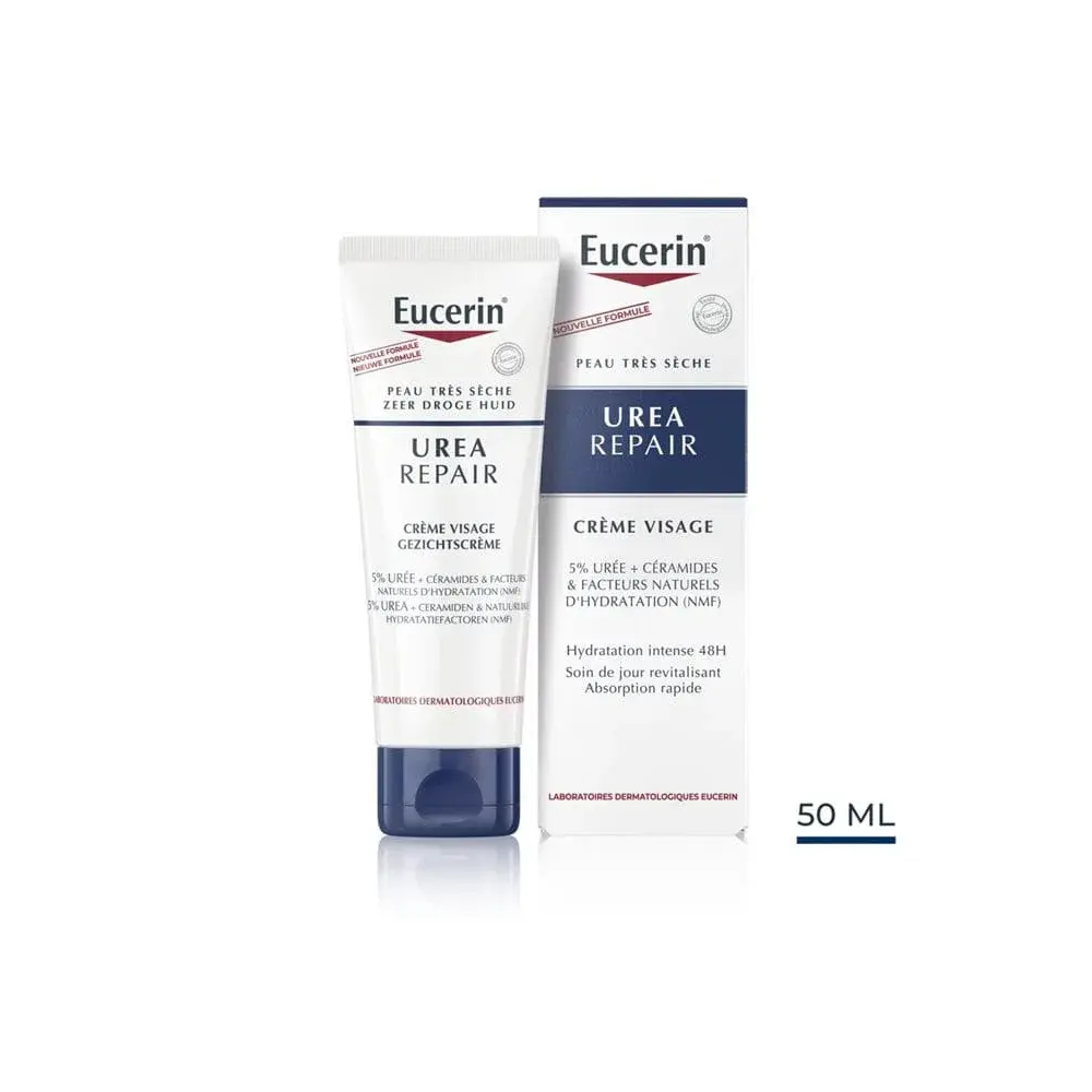 La crème visage peau sèche à l’Urea repair d’Eucerin a été conçue spécialement pour prendre soin des peaux sèches en les réhydratant. et ainsi leur redonner de l’éclat. de la souplesse et de l’élasticité. Elle permet également d’apaiser les sensations de tiraillement. et d’offrir une grande sensation de douceur dès l’application. Élaborée avec une formule haute tolérance. testée sous contrôle dermatologique. qui ne contient ni parfum ni colorants. cette crème Eucerin pénètre instantanément le visage et agit en profondeur pour réhydrater correctement l’épiderme et le nourrir. afin que la peau retrouve tout son éclat. On trouve deux principes actifs principaux dans cette crème visage. à savoir dans un premier temps de l’urée. à hauteur de 5 % de la composition totale. Cette substance est naturellement produite par la peau afin d’en réguler l’hydratation car elle est hygroscopique. c’est-à-dire qu’elle absorbe l’humidité pour la stocker dans la partie supérieure de la peau. à savoir la couche cornée. L’urée est également kératolytique. puisqu’elle détruit les connexions entre les cellules mortes de la peau. ce qui permet ainsi de lisser la surface de la peau. Du lactate est également utilisé. ce dernier étant aussi un facteur naturel d’hydratation produit de façon autonome par la peau. et qui a pour rôle de retenir l’eau au niveau de la couche cornée. L’association de ces deux actifs aide au rétablissement du niveau d’hydratation optimal de la peau. et lui redonne par la même un aspect lisse et un regain de douceur. tout en apaisant les sensations de tiraillement et les démangeaisons.
