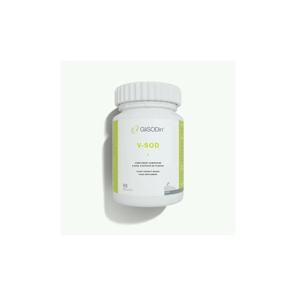 GLISODIN V-SOD est un complément alimentaire conçu pour offrir une protection antioxydante complète et renforcer les défenses naturelles de l'organisme. Sa formule unique, à base de Superoxyde Dismutase (SOD) de melon, aide à neutraliser les radicaux libres et à protéger les cellules contre le stress oxydatif.