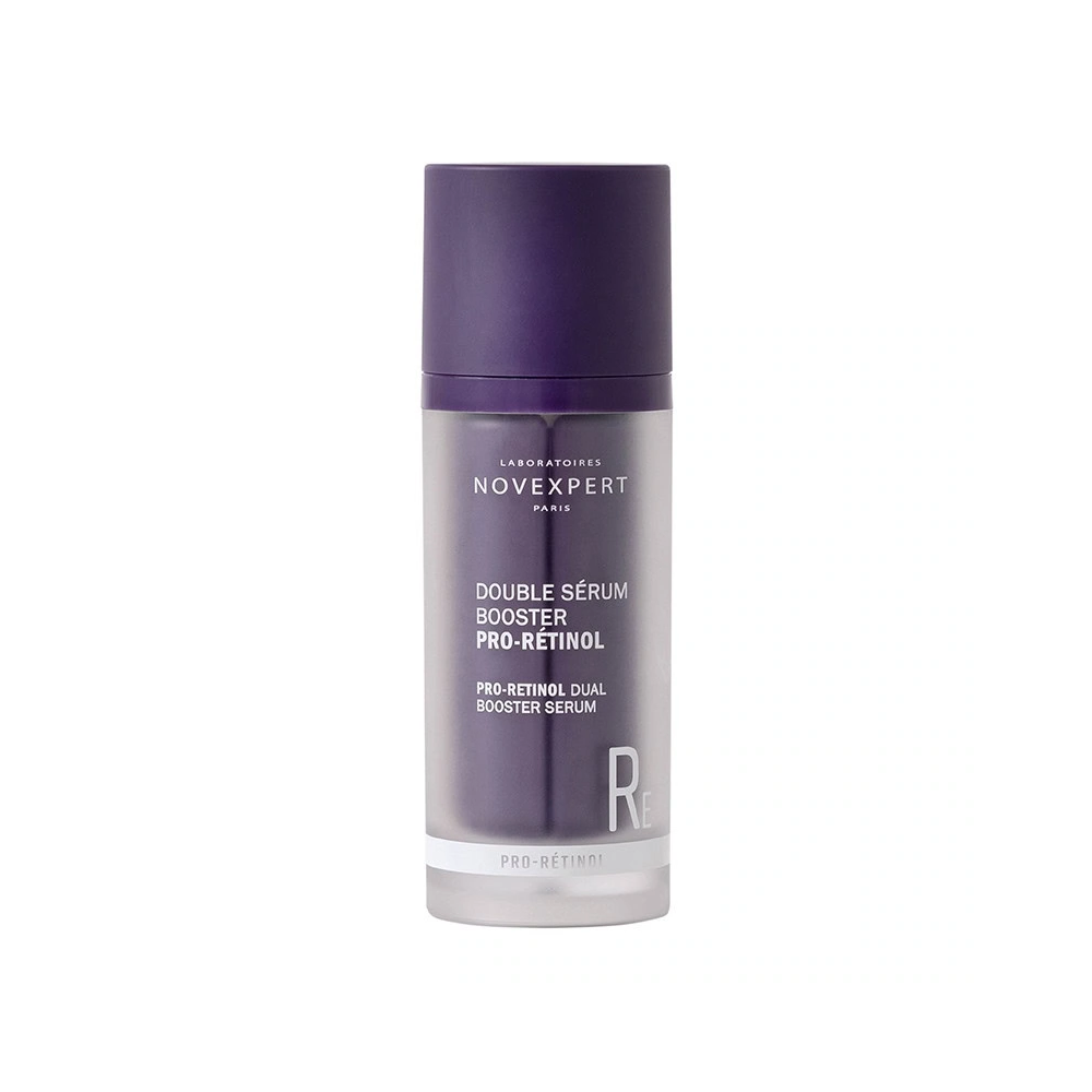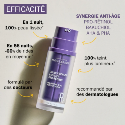 Le NOVEXPERT DOUBLE SERUM BOOSTER PRO RÉTINOL est un soin de nuit anti-âge innovant, présenté sous une double formulation (une micro-émulsion lipidique et un gel aqueux) que l'on mélange à l'application. Cette prouesse cosmétique réunit pour la première fois trois complexes anti-âge puissants : le Pro-Rétinol (précurseur végétal de la Vitamine A), le Bakuchiol (Rétinol-like) et deux acides de fruits doux (AHA/Acide Lactique et PHA/Gluconolactone). Conçu pour être utilisé uniquement le soir, il profite du processus naturel de régénération nocturne de la peau pour lisser, illuminer et raffermir la peau. Il est reconnu pour son action rapide sur l'aspect lisse de la peau dès la première nuit et pour sa capacité à réduire les rides de moitié en 56 nuits.